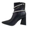 Bota feminina, confeccionada em material sintético, tira em strass transpassada, cano curto, salto alto grosso, bico fino e fechamento por zíper.